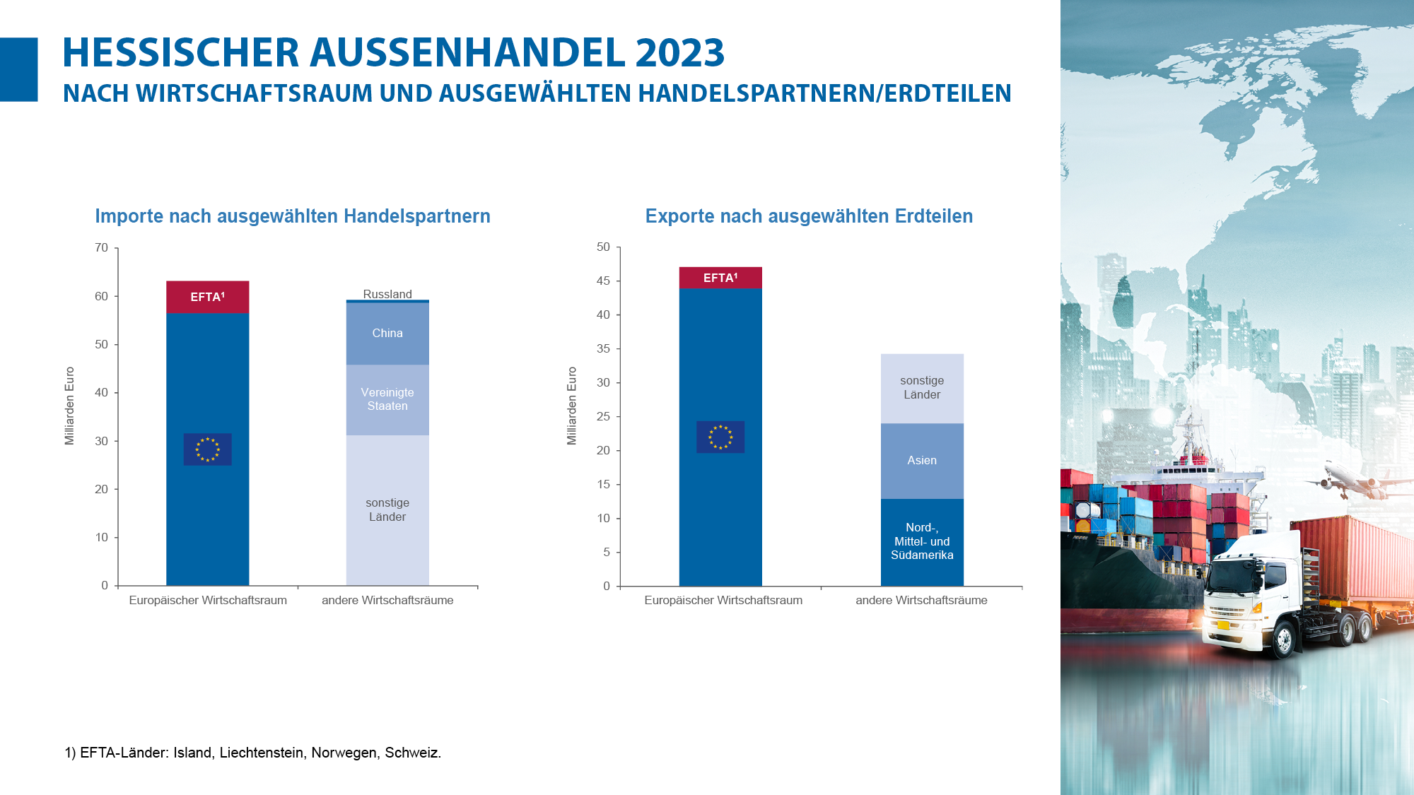 Hessischer Außenhandel 2023 nach Wirtschaftsraum und ausgewählten Handelspartnern/Erdteilen