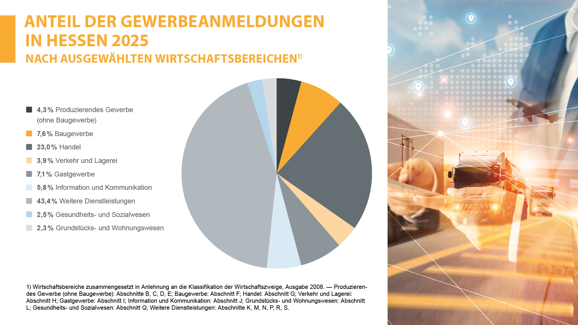 Anteil der Gewerbeanmeldungen in Hessen nach ausgewählten Wirtschaftsbereichen