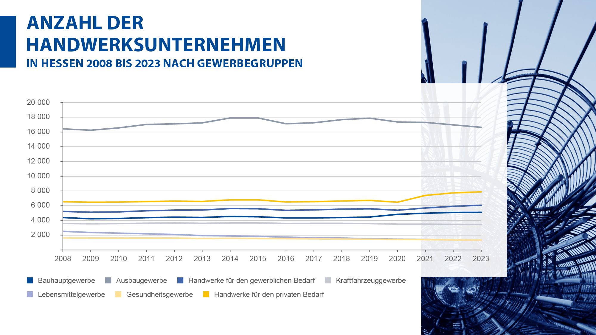 Handwerk Anzahl der Handwerksunternehmen in Hessen nach Gewerbegruppen Logo - Auf Facebook teilen Öffnet sich in einem neuen Fenster Logo - Auf X teilen Öffnet sich in einem neuen Fenster Logo - Auf LinkedIn teilen Öffnet sich in einem neuen Fenster Logo - Auf Xing teilen Öffnet sich in einem neuen Fenster Logo - Auf E-Mail teilen Öffnet sich in einem neuen Fenster Logo -Drucken © Hessisches Statistisches Landesamt, 2025 — stock.adobe.com | Inzyx Vervielfältigung und Verbreitung, auch auszugsweise, mit Quellenangabe gestattet. Bild in Originalgröße herunterladen Zurück Schlagworte zum Thema Handwerk Unternehmen Gewerbe Bauhauptgewerbe Ausbaugewerbe Kraftfahrzeuggewerbe Gesundheitsgewerbe