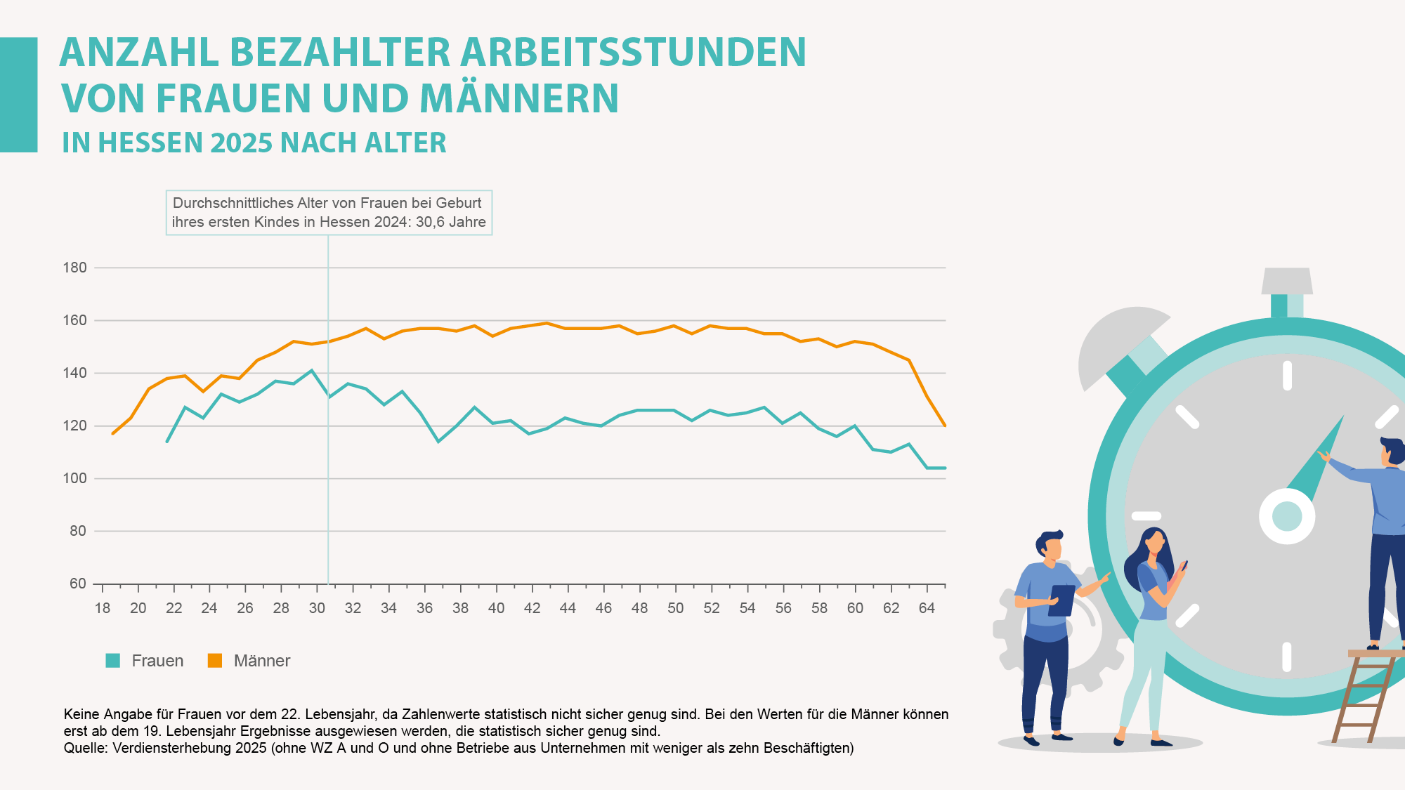 Anzahl bezahlter Arbeitsstunden von Frauen und Männern in Hessen 2025 nach Alter