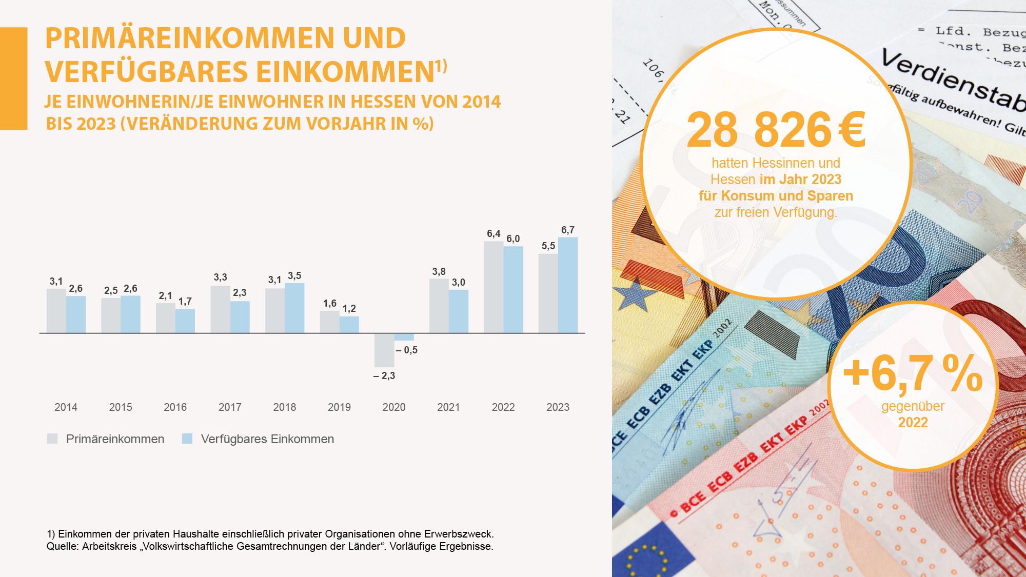 Primäreinkommen und verfügbares Einkommen je Einwohnerin / je Einwohner in Hessen von 2014 bis 2023